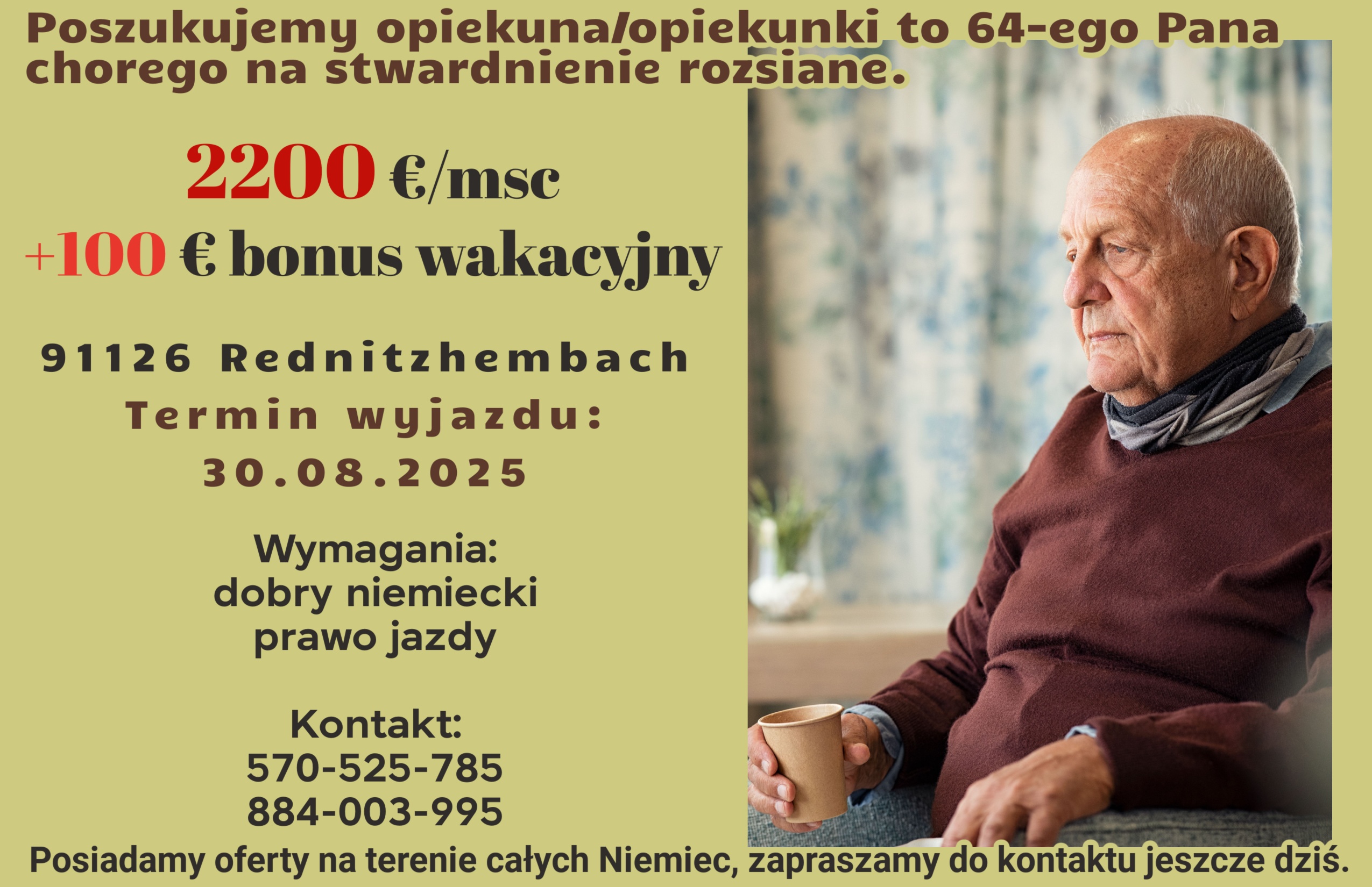 Poszukujemy opiekuna/opiekunki do 64-ego Pana chorego na stwardnienie rozsiane.