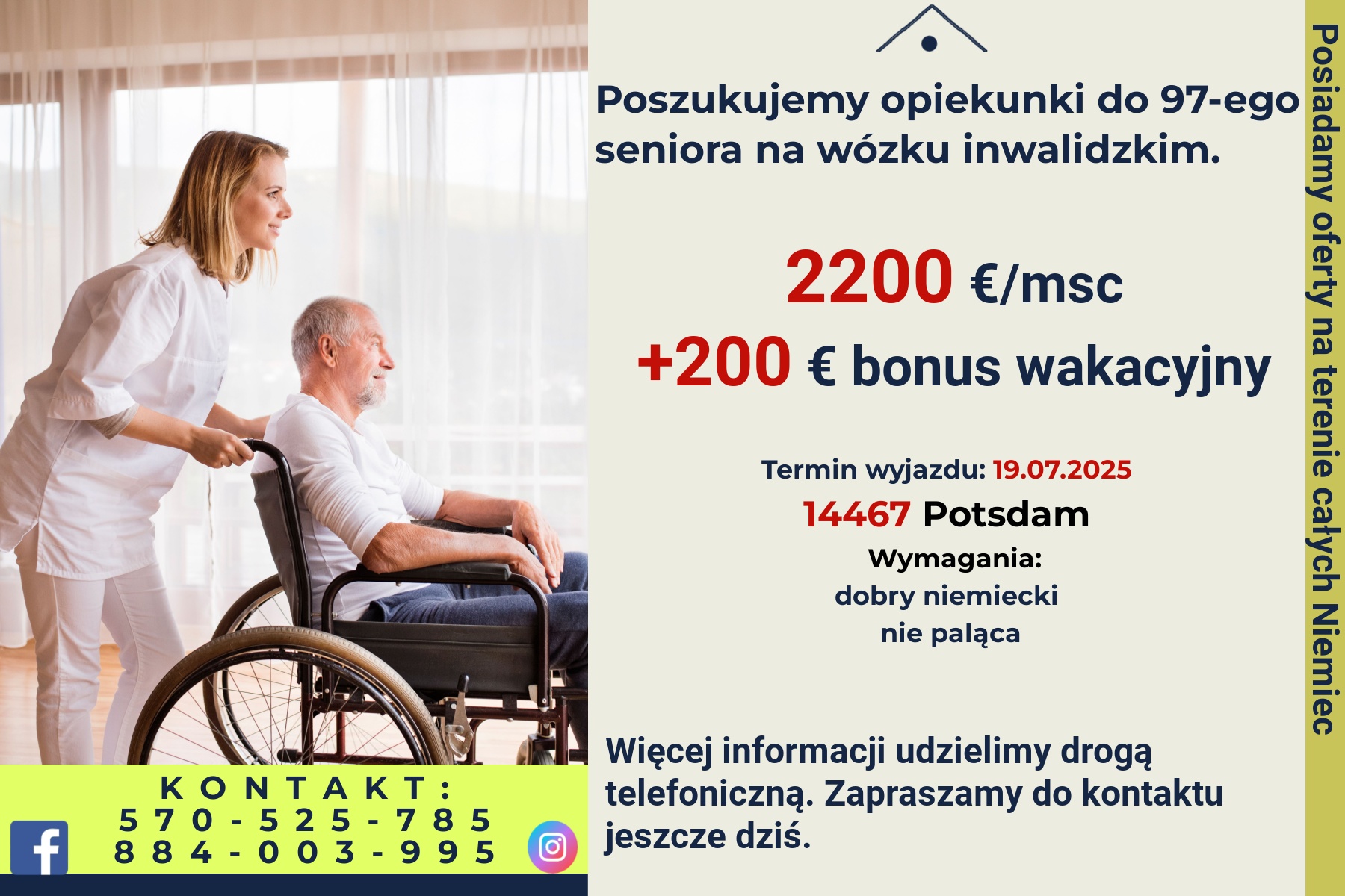 Poszukujemy opiekunki do 97-ego seniora na wózku inwalidzkim.