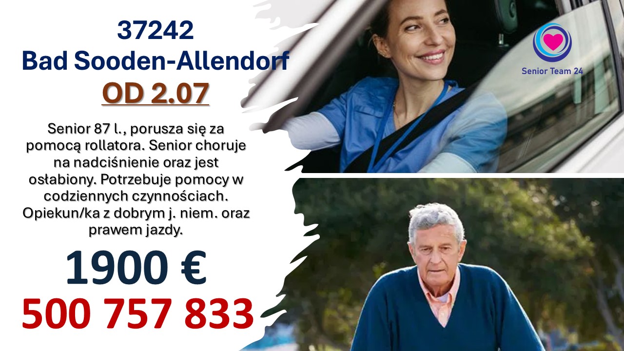 Do opieki Senior (87 l., 75 kg., 180 cm.) Senior porusza się za pomocą rollatora. Ma problemy z chodzeniem. Pan choruje na nadciśnienie oraz osłabienie starcze. Zlecenie bez nocek.