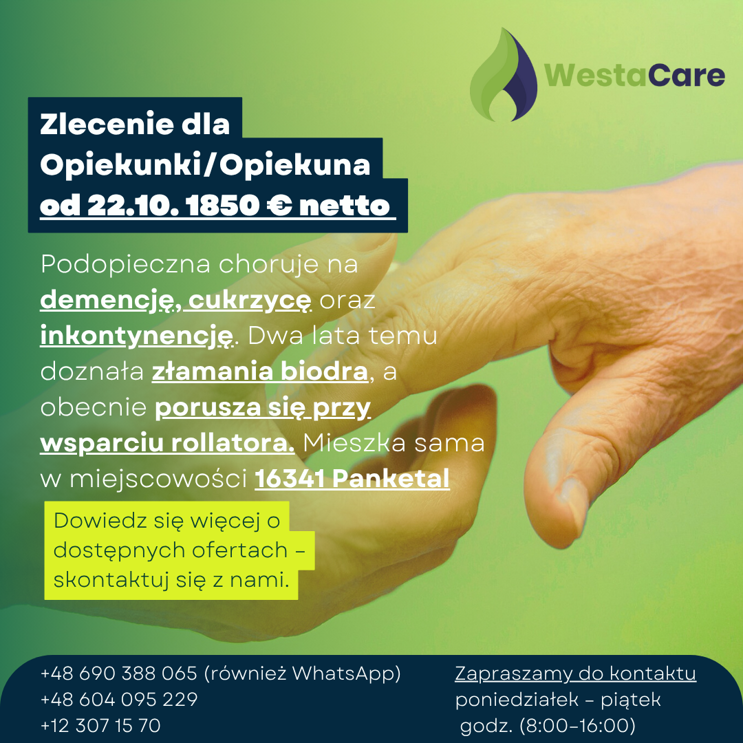 Zlecenie dla Opiekunki/Opiekuna od 22.10. 1850 € netto