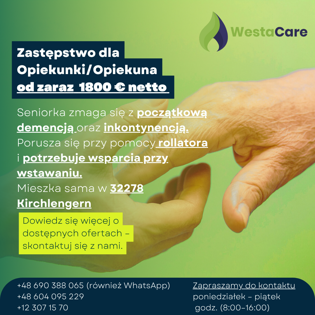 Zastępstwo dla Opiekunki/Opiekuna od zaraz 1800 € netto