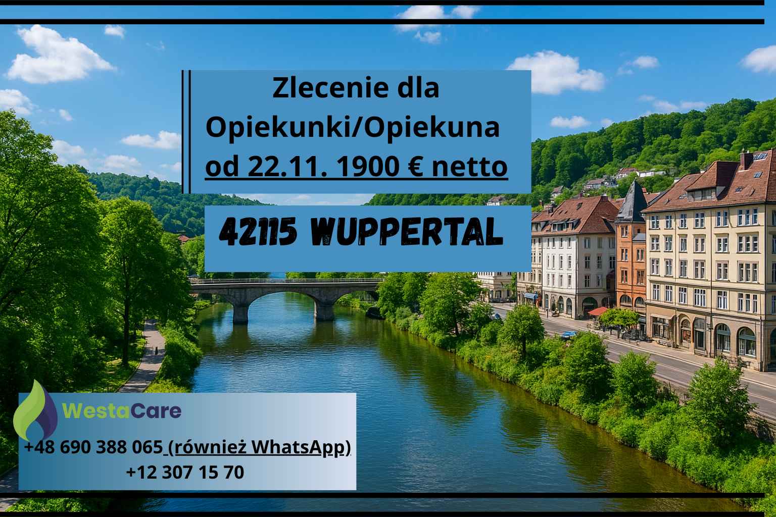 Pani mieszka sama w mieszkaniu o powierzchni 90 m² w 42115 Wuppertalu, pięknym mieście słynącym z unikalnej kolejki linowej „Schwebebahn” i malowniczych terenów nad rzeką Wupper. Opiekun lub Opiekunka ma do dyspozycji umeblowany pokój gościnny z dostępem do internetu.