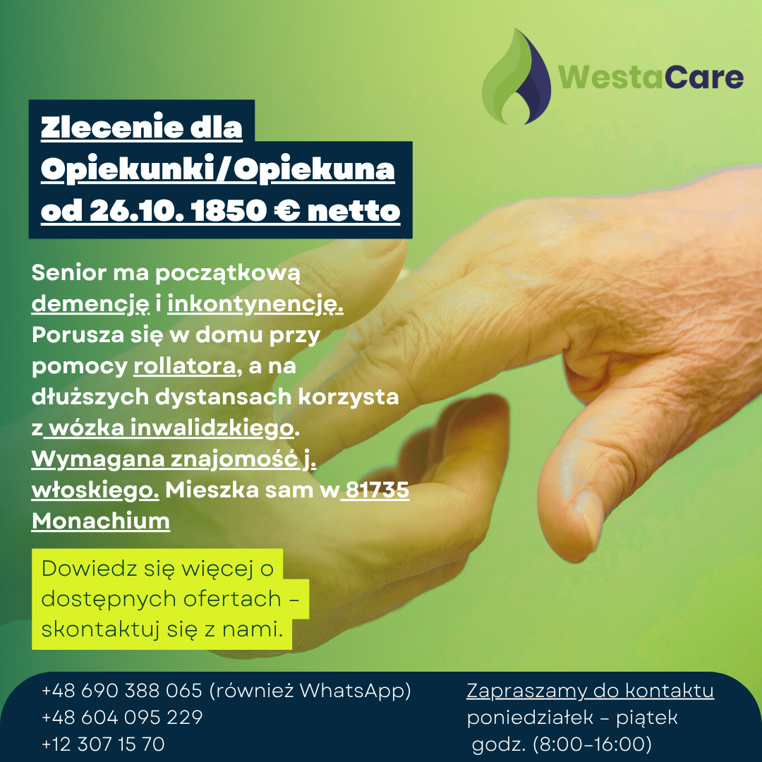 Zlecenie dla Opiekunki/Opiekuna od 26.10. 1850 € netto