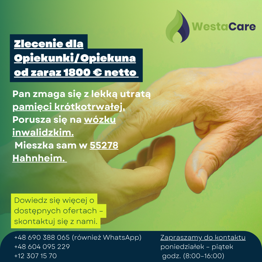 Zlecenie dla Opiekunki/Opiekuna od zaraz 1800 € netto