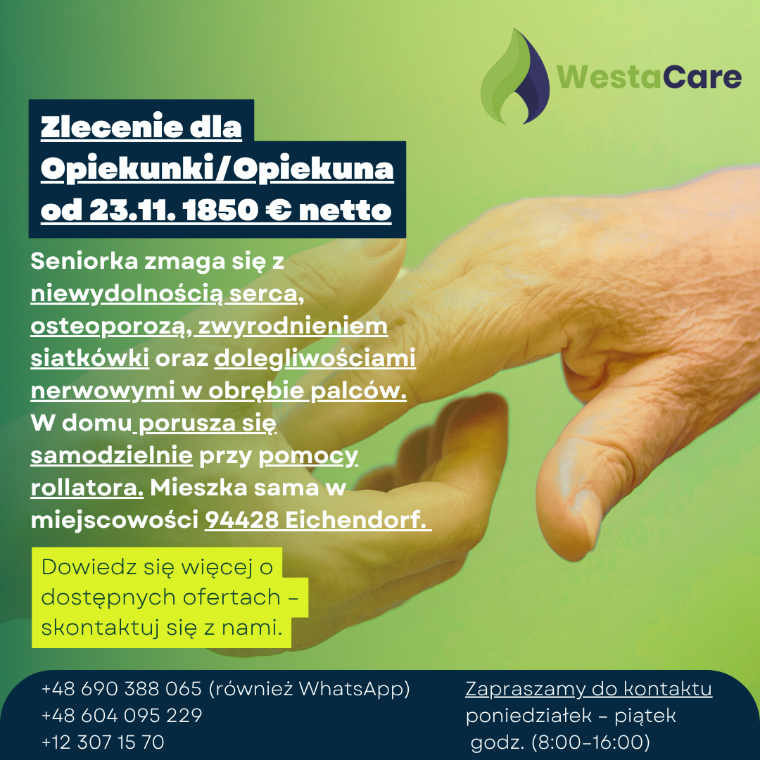 Zlecenie dla Opiekunki/Opiekuna od 23.11. 1850 € netto