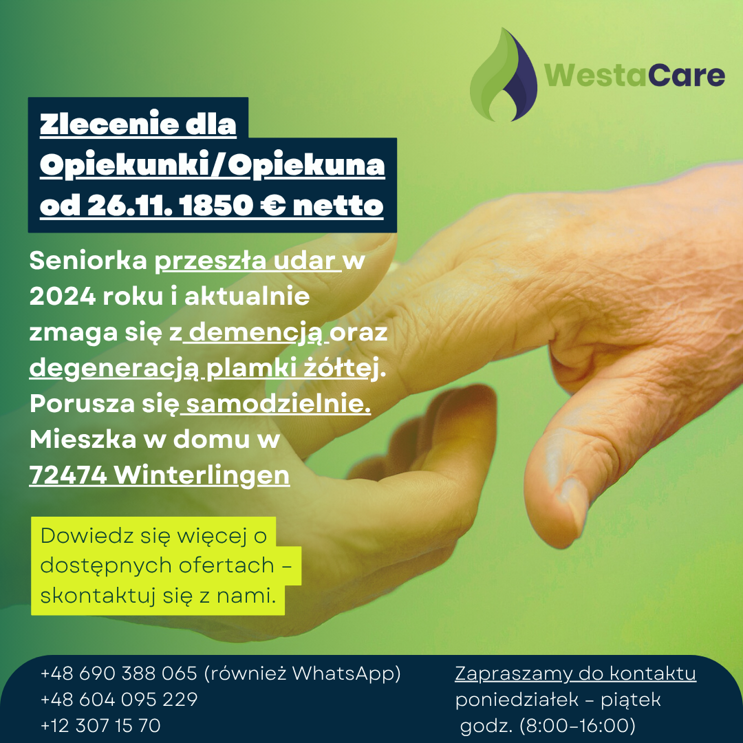 Zlecenie dla Opiekunki/Opiekuna od 26.11. 1850 € netto