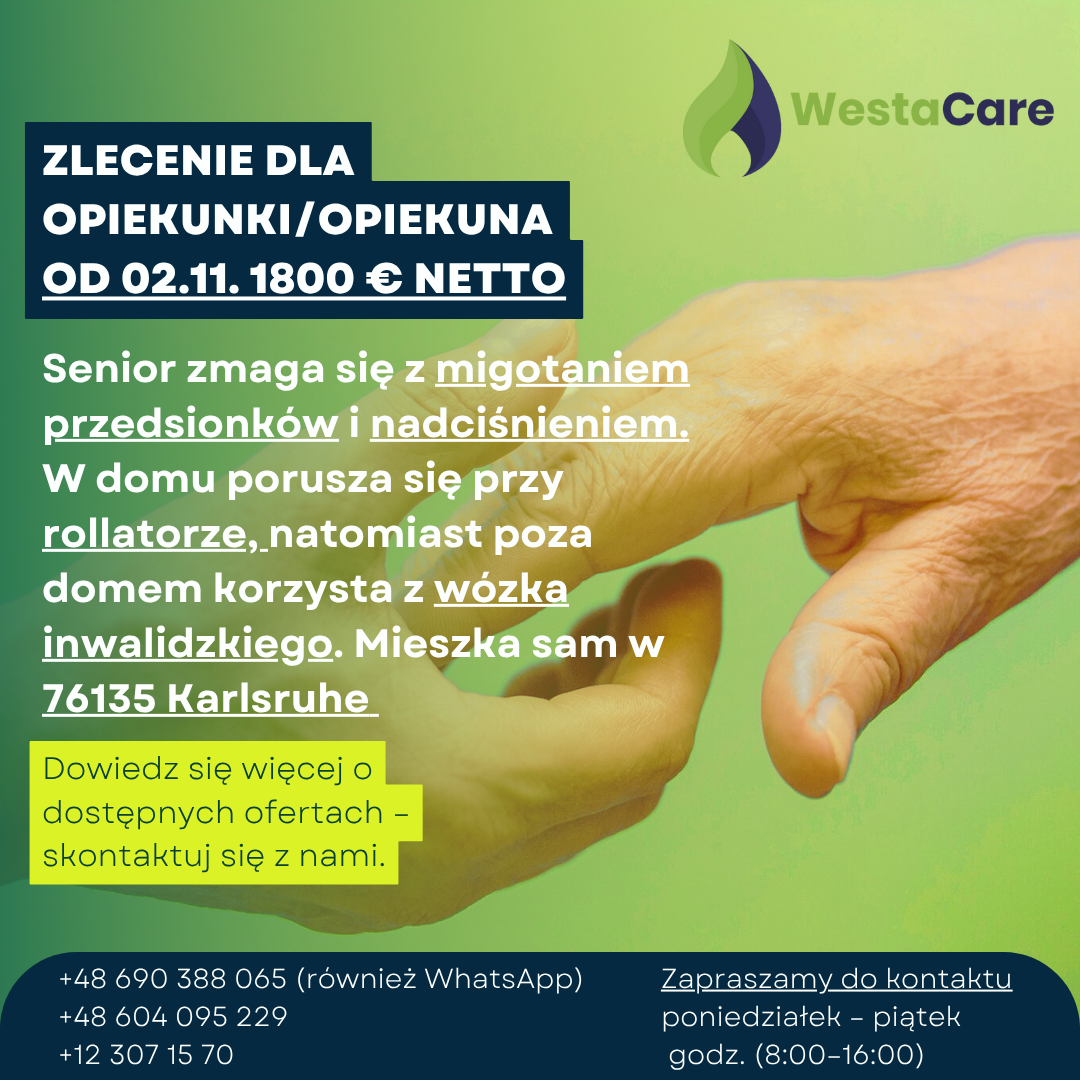 Zlecenie dla Opiekunki/Opiekuna od 02.11. 1800 € netto