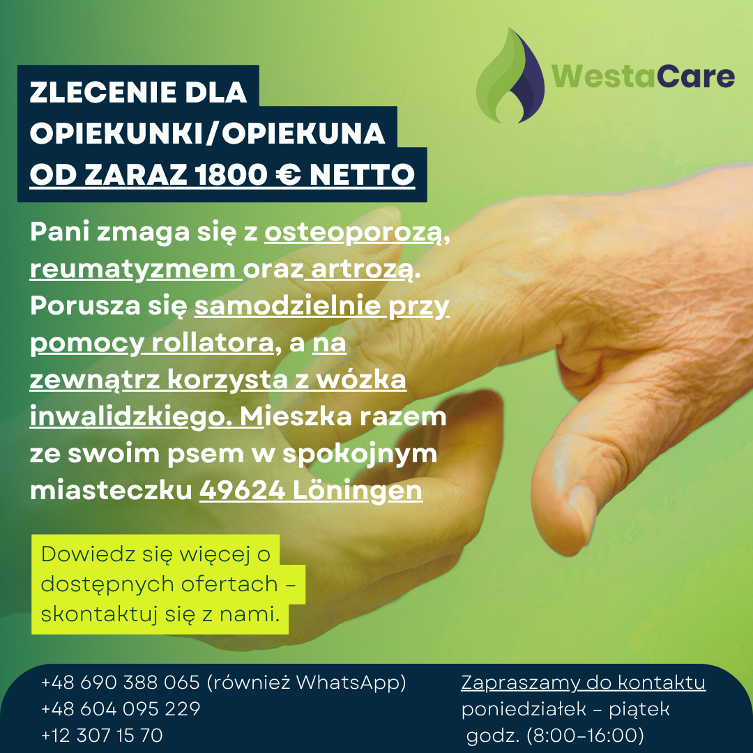 Zlecenie dla Opiekunki/Opiekuna od zaraz 1800 € netto