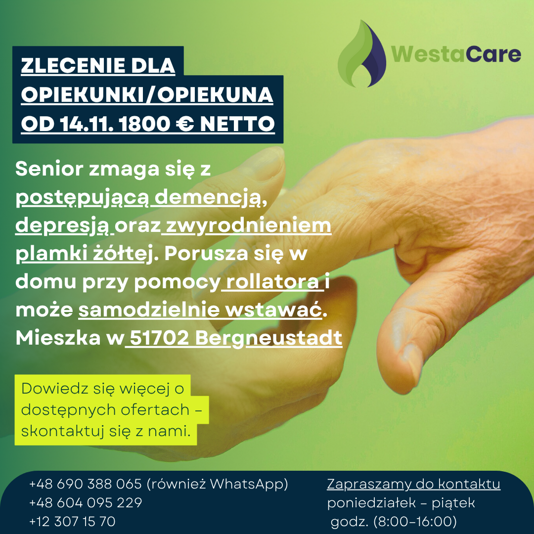 Zlecenie dla Opiekunki/Opiekuna od 14.11. 1800 € netto