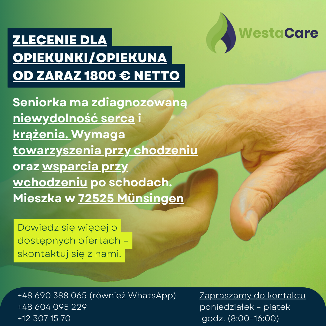 Zlecenie dla Opiekunki/Opiekuna od zaraz 1800 € netto