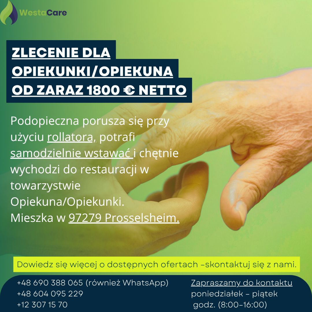 Zlecenie dla Opiekunki/Opiekuna od zaraz 1800 € netto