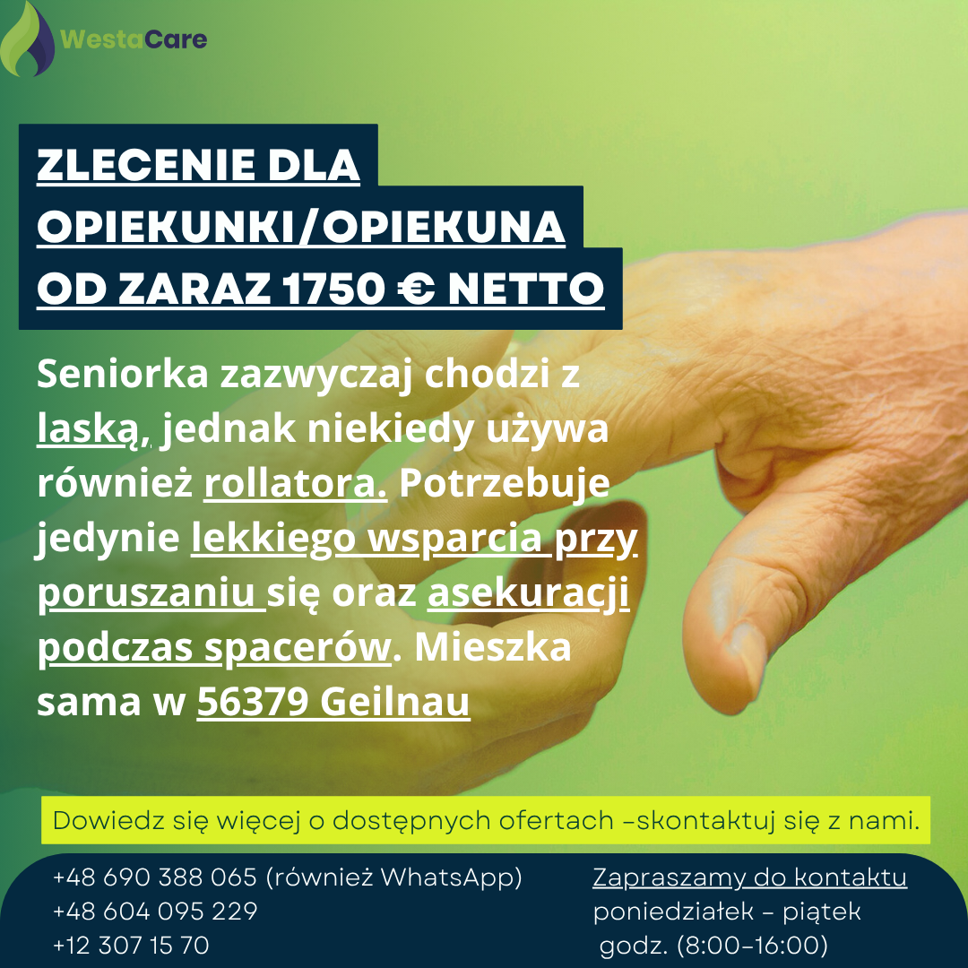 Zlecenie dla Opiekunki/Opiekuna od zaraz 1750 € netto