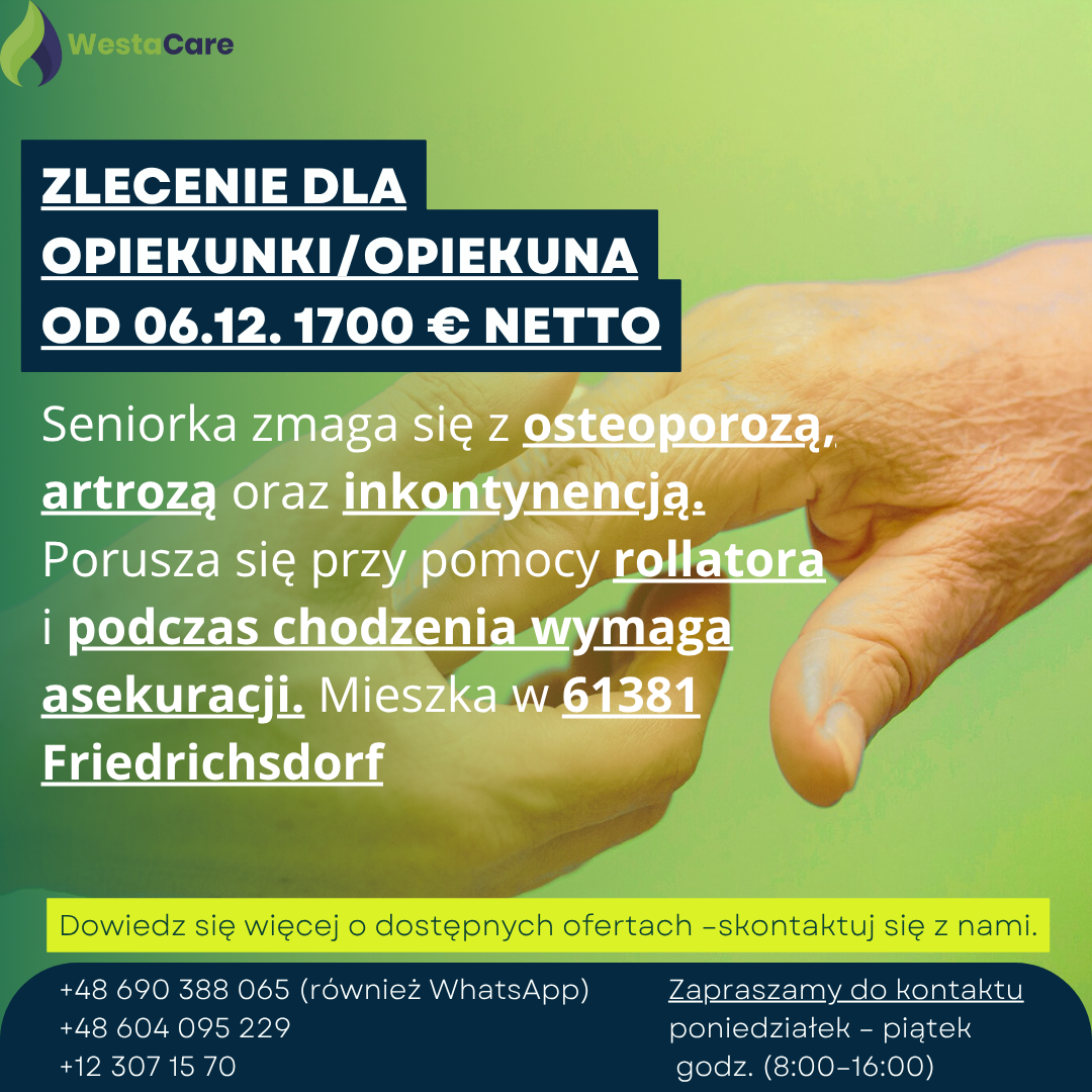 Zlecenie dla Opiekunki/Opiekuna od 06.12. 1700 € netto