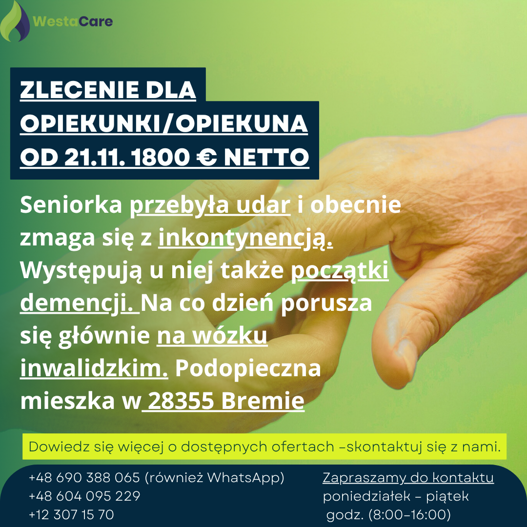 Zlecenie dla Opiekunki/Opiekuna od 21.11. 1800 € netto
