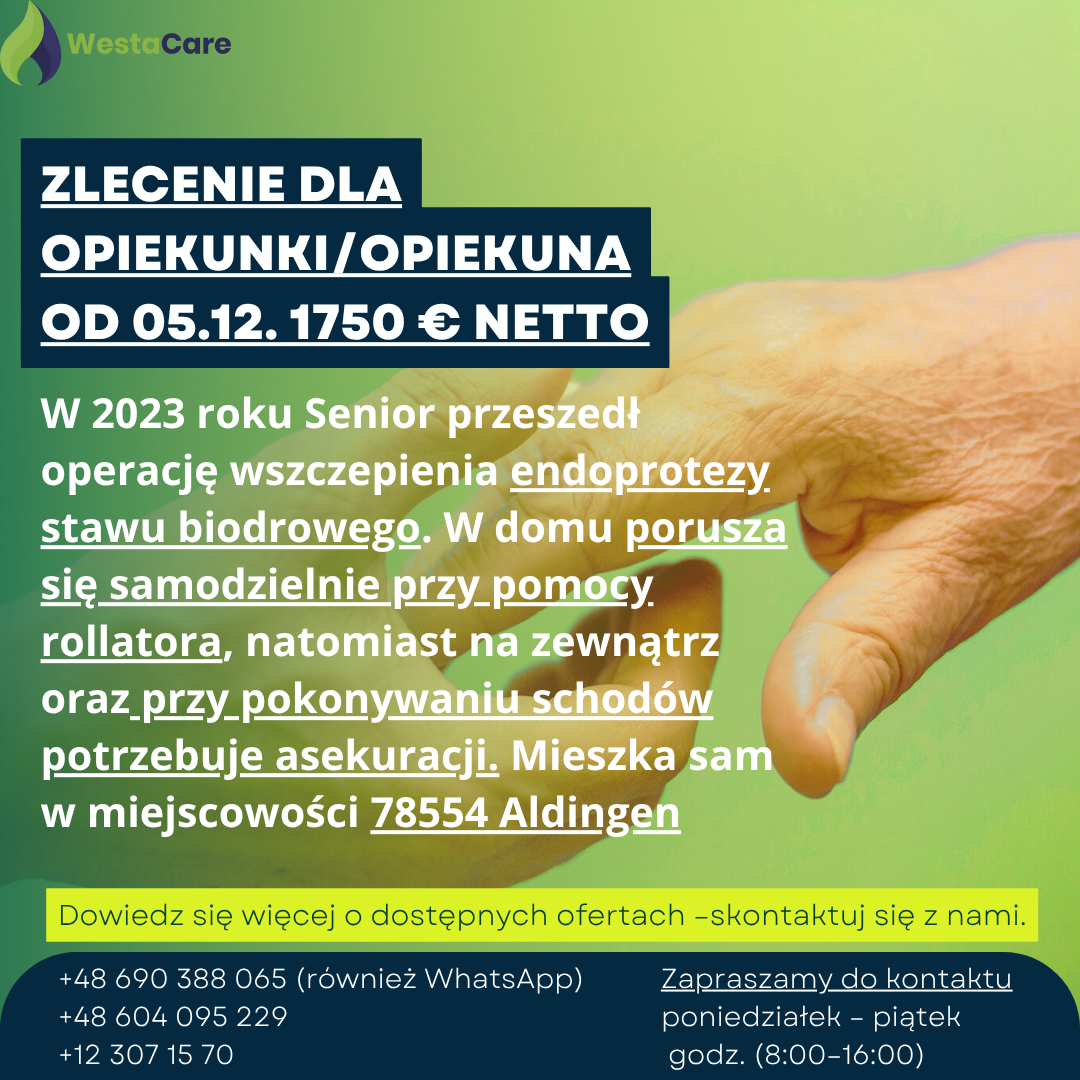 Zlecenie dla Opiekunki/Opiekuna od 05.12. 1750 € netto