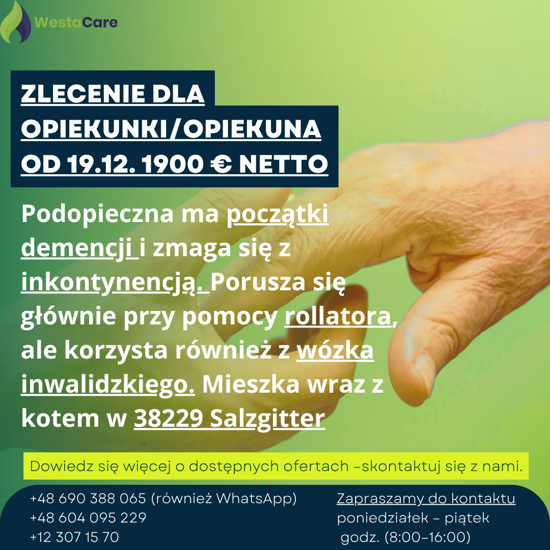 Zlecenie dla Opiekunki/Opiekuna od 19.12. 1900 € netto