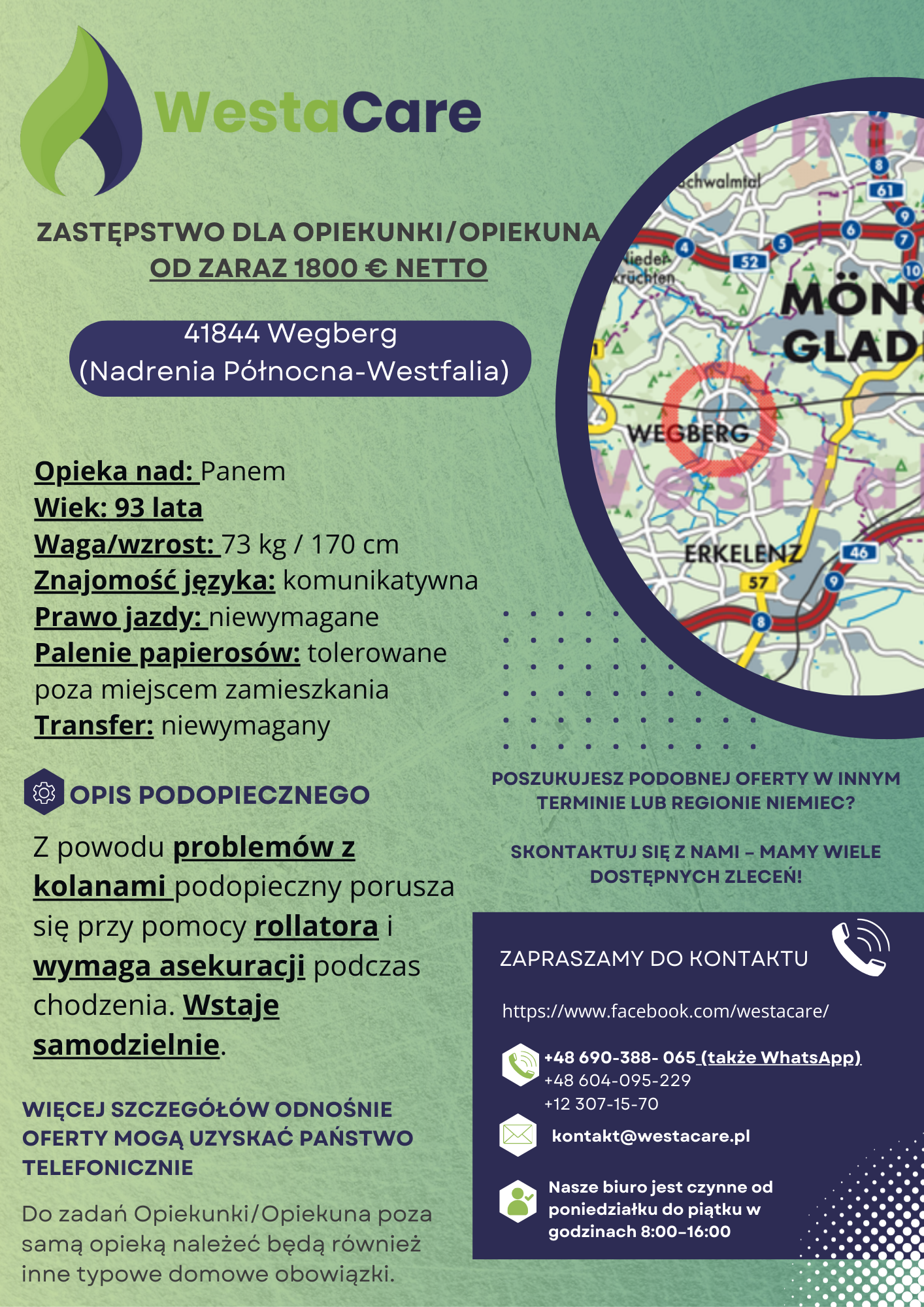 Pan mieszka sam w domu w 41844 Wegbergu — spokojnym i zielonym miasteczku w Nadrenii Północnej-Westfalii, znanym z urokliwych tras spacerowych, młynów wodnych i przyjaznej atmosfery. W mieście dostępne są sklepy takie jak Aldi, Lidl, Edeka czy Rossmann, a także apteki i kawiarnie. W pobliżu znajdują się miejscowości takie jak Mönchengladbach, Erkelenz czy Heinsberg. Dla Opiekuna lub Opiekunki przygotowano w pełni wyposażony pokój z dostępem do internetu
