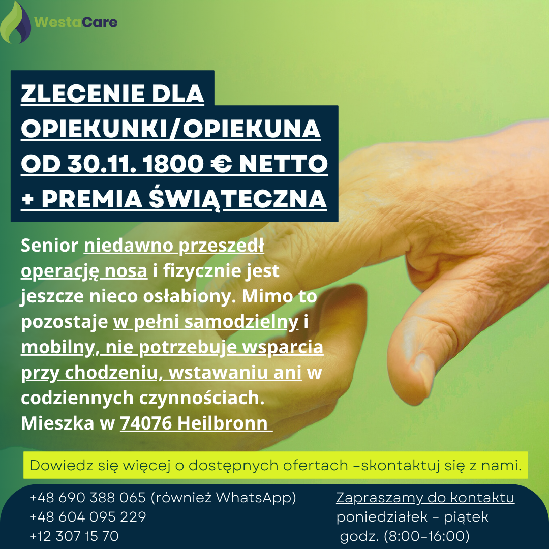 Zlecenie dla Opiekunki/Opiekuna od 30.11. 1800 € netto + Premia Świąteczna