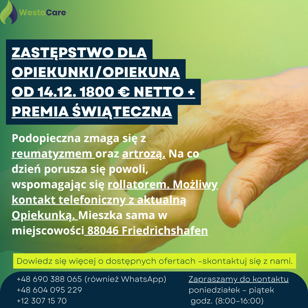 Zastępstwo dla Opiekunki/Opiekuna od 14.12. 1800 € netto + Premia Świąteczna