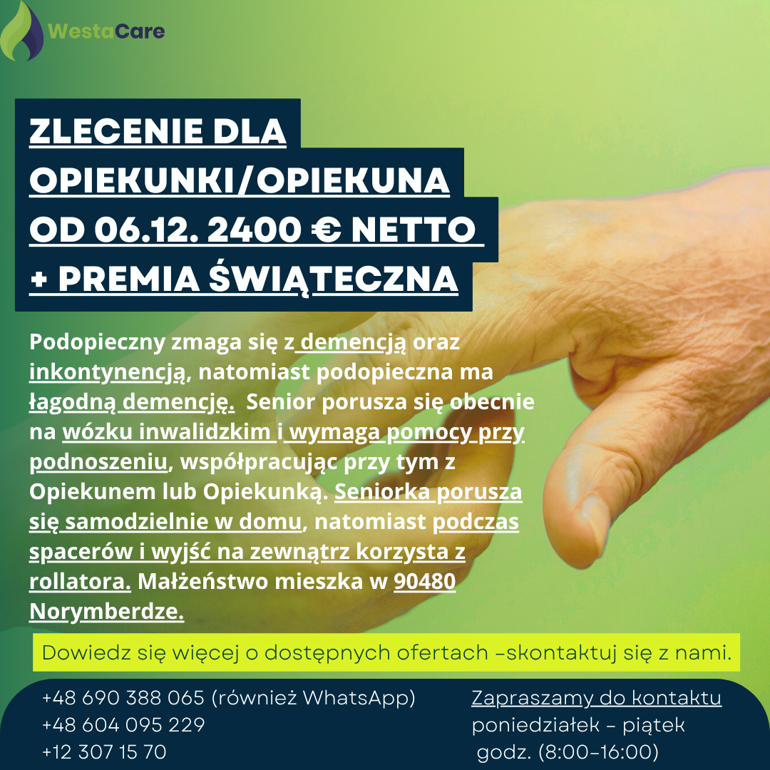 Zlecenie dla Opiekunki/Opiekuna od 06.12. 2400 € netto + Premia Świąteczna