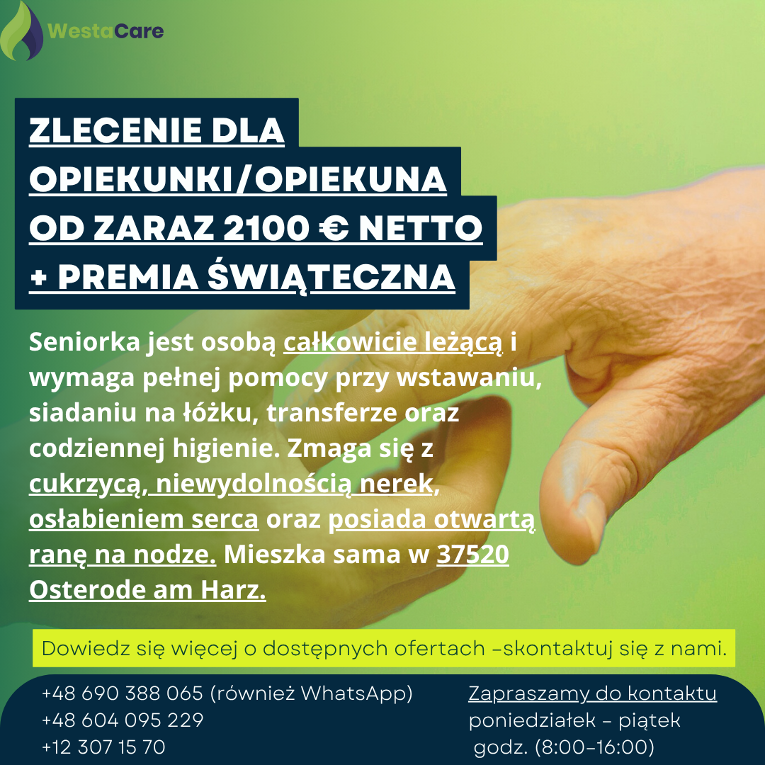 Zlecenie dla Opiekunki/Opiekuna od zaraz 2100 € netto + Premia Świąteczna