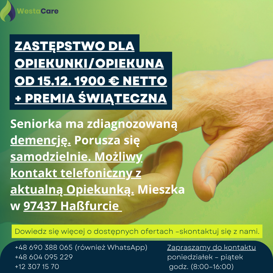 Zastępstwo dla Opiekunki/Opiekuna od 15.12. 1900 € netto + Premia Świąteczna