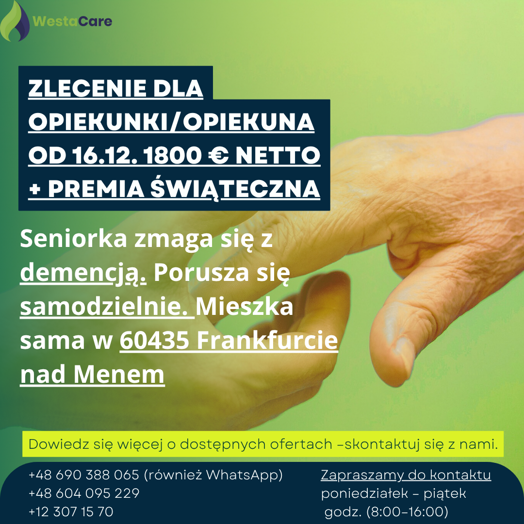 Zlecenie dla Opiekunki/Opiekuna od 16.12. 1800 € netto + Premia Świąteczna