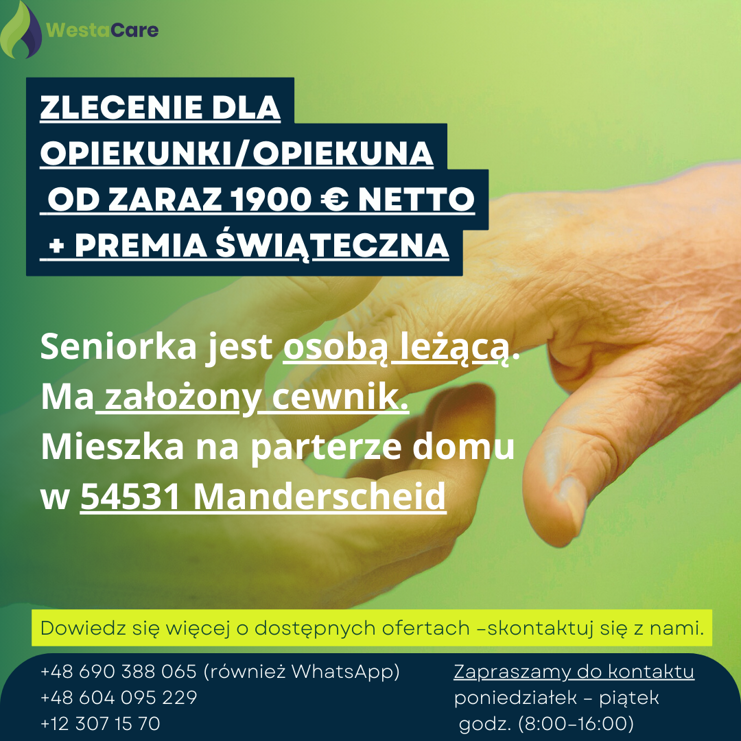 Zlecenie dla Opiekunki/Opiekuna od zaraz 1900 € netto + Premia Świąteczna