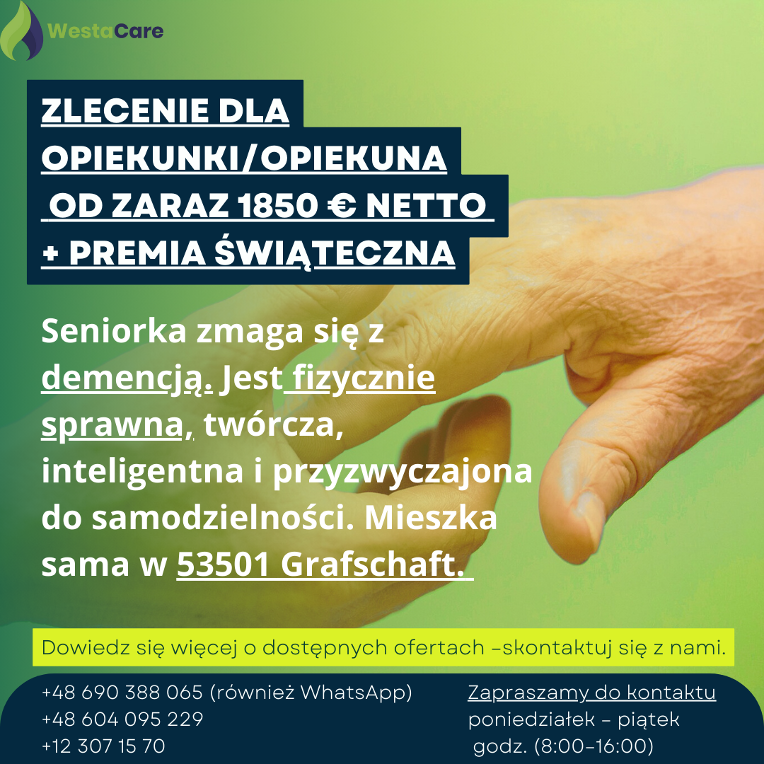 Zlecenie dla Opiekunki/Opiekuna od zaraz 1850 € netto + Premia Świąteczna