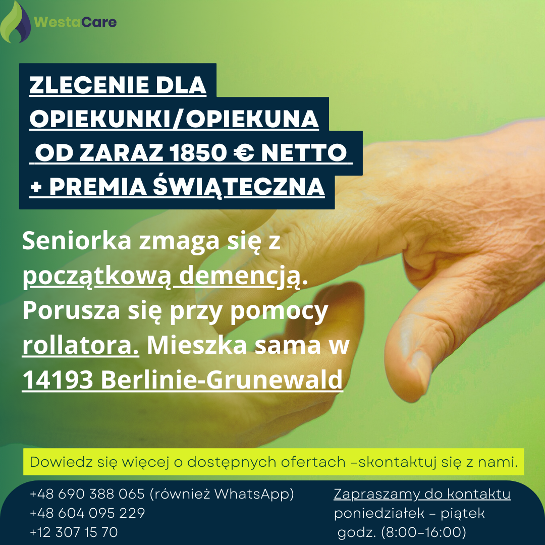 Zlecenie dla Opiekunki/Opiekuna od zaraz 1850 € netto + Premia Świąteczna
