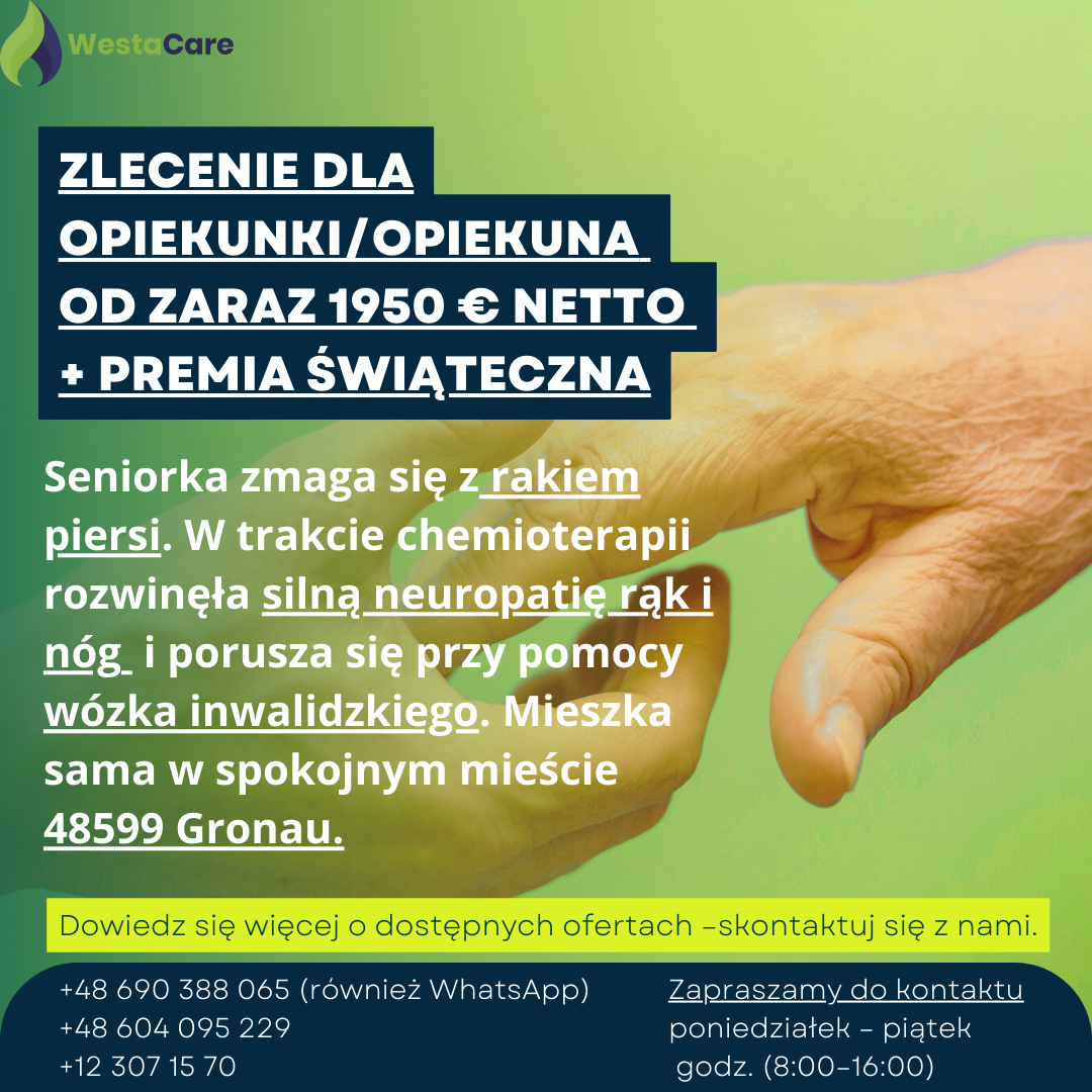 Zlecenie dla Opiekunki/Opiekuna od zaraz 1950 € netto + Premia Świąteczna