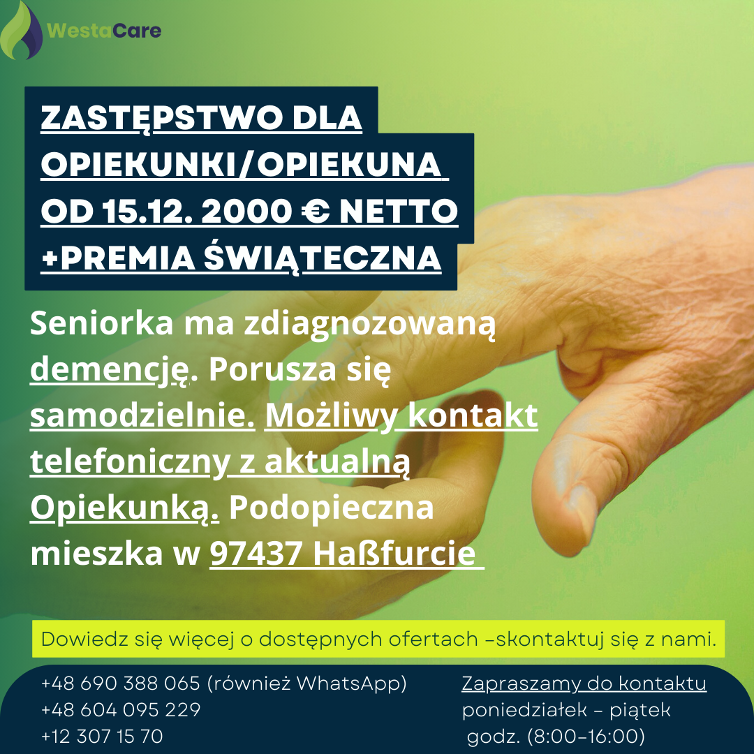 Zastępstwo dla Opiekunki/Opiekuna od 15.12. 2000 € netto + Premia Świąteczna