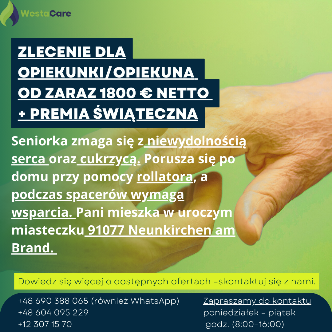 Zlecenie dla Opiekunki/Opiekuna od zaraz 1800 € netto + Premia Świąteczna