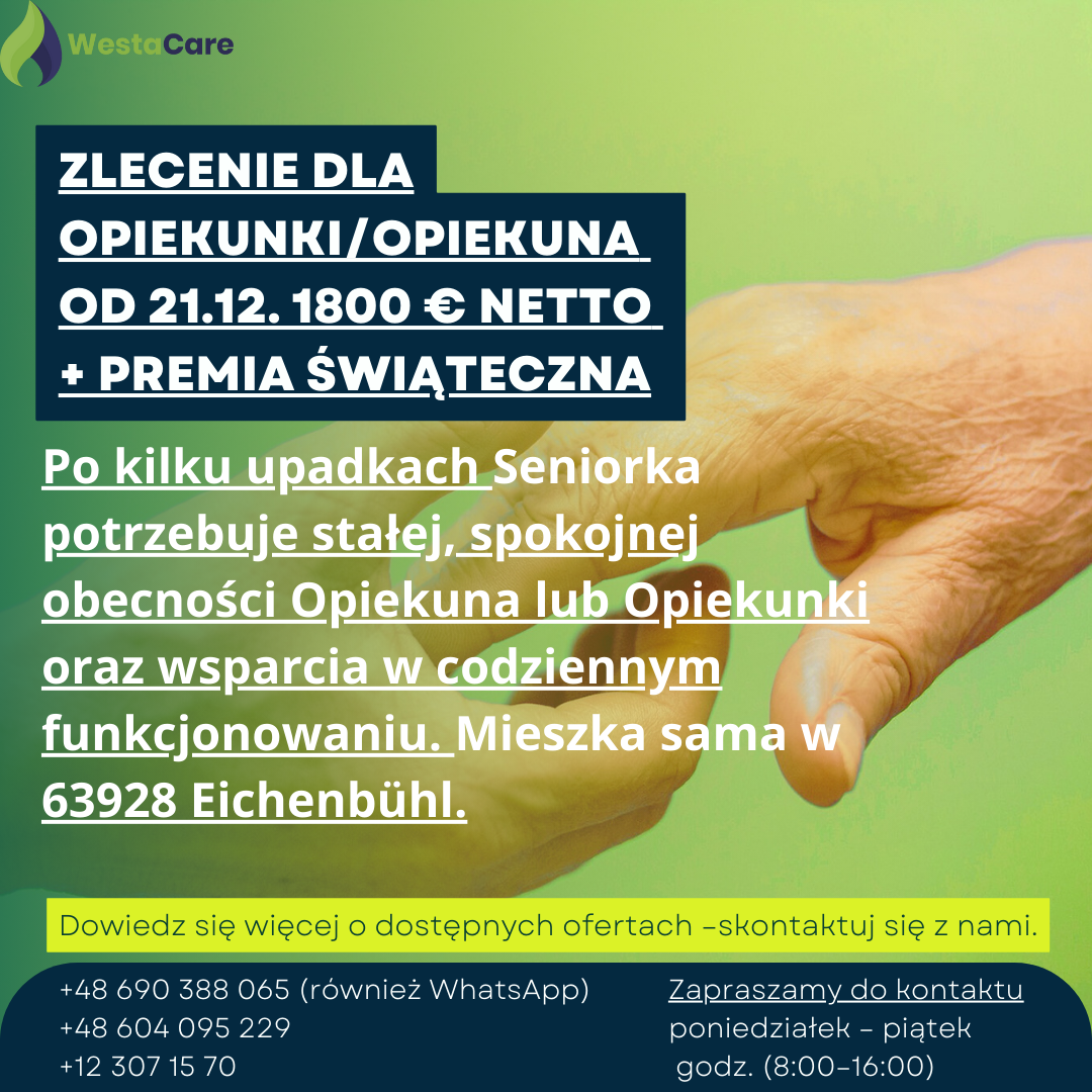 Zlecenie dla Opiekunki/Opiekuna od 21.12. 1800 € netto + Premia Świąteczna
