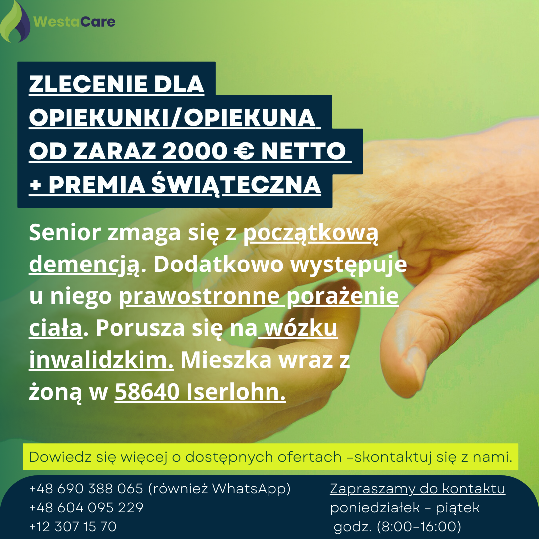 Zlecenie dla Opiekunki/Opiekuna od zaraz 2000 € netto + Premia Świąteczna