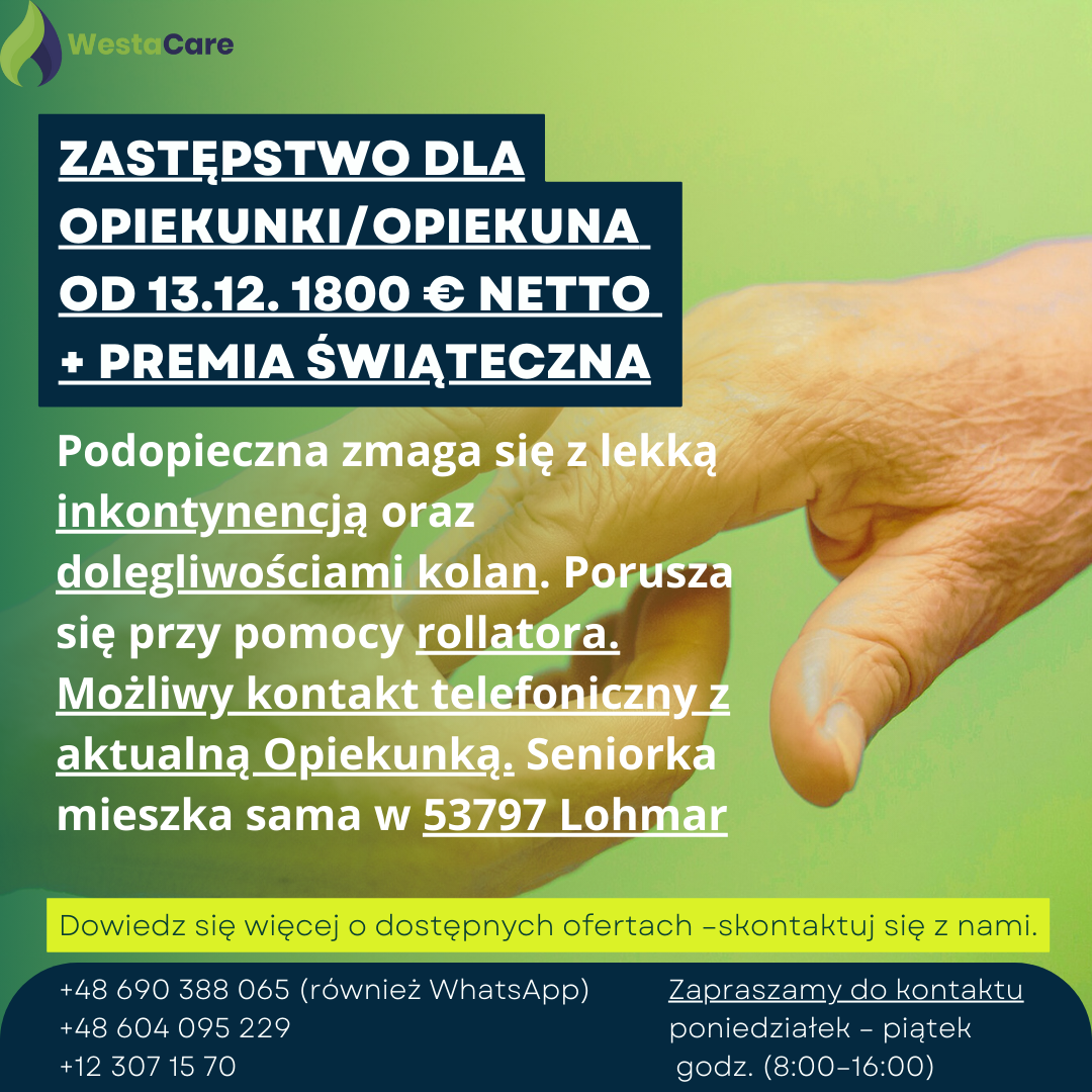 Zastępstwo dla Opiekunki/Opiekuna od 13.12. 1800 € netto + Premia Świąteczna