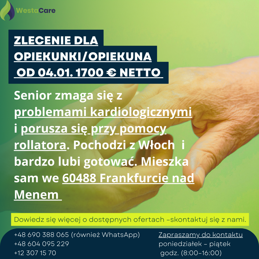 Zlecenie dla Opiekunki/Opiekuna od 04.01. 1700 € netto