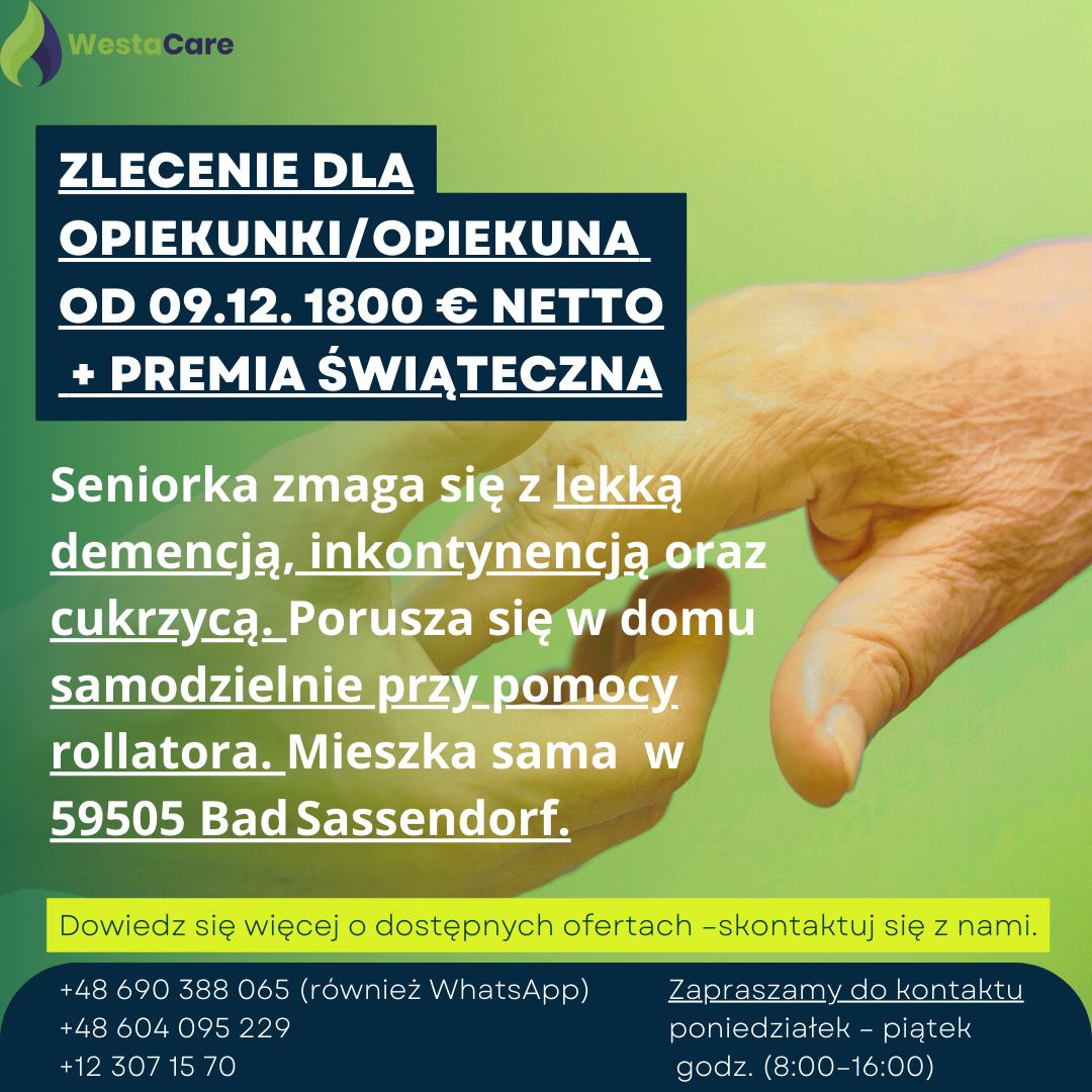 Zlecenie dla Opiekunki/Opiekuna od 09.12. 1800 € netto + Premia Świąteczna