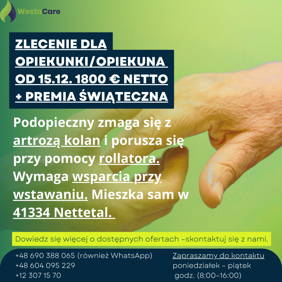 Zlecenie dla Opiekunki/Opiekuna od 15.12. 1800 € netto + Premia Świąteczna