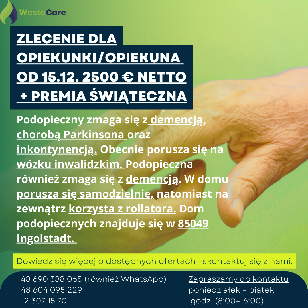 Zlecenie dla Opiekunki/Opiekuna od 15.12. 2500 € netto + Premia Świąteczna