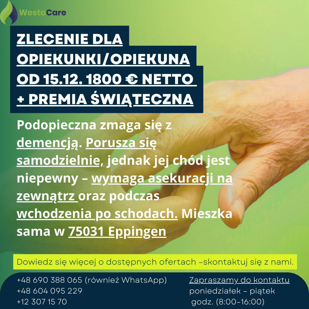 Zlecenie dla Opiekunki/Opiekuna od 15.12. 1800 € netto + Premia Świąteczna