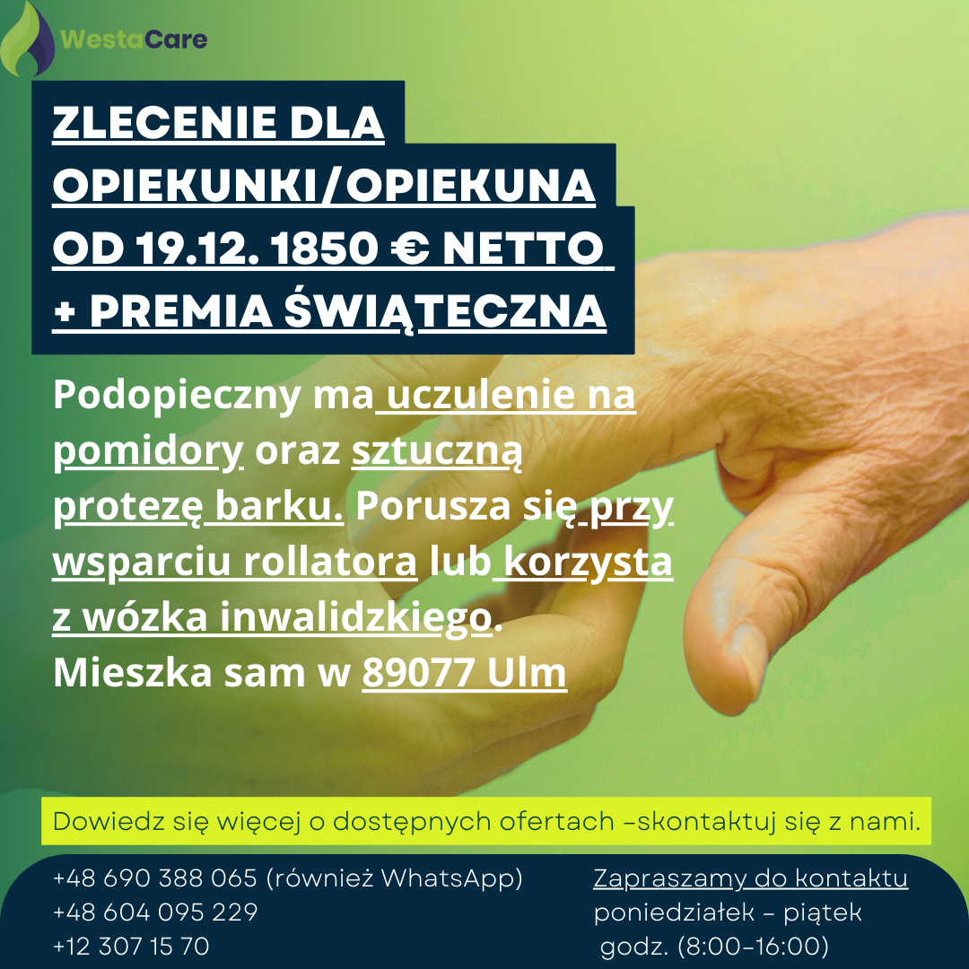 Zlecenie dla Opiekunki/Opiekuna od 19.12. 1850 € netto + Premia Świąteczna