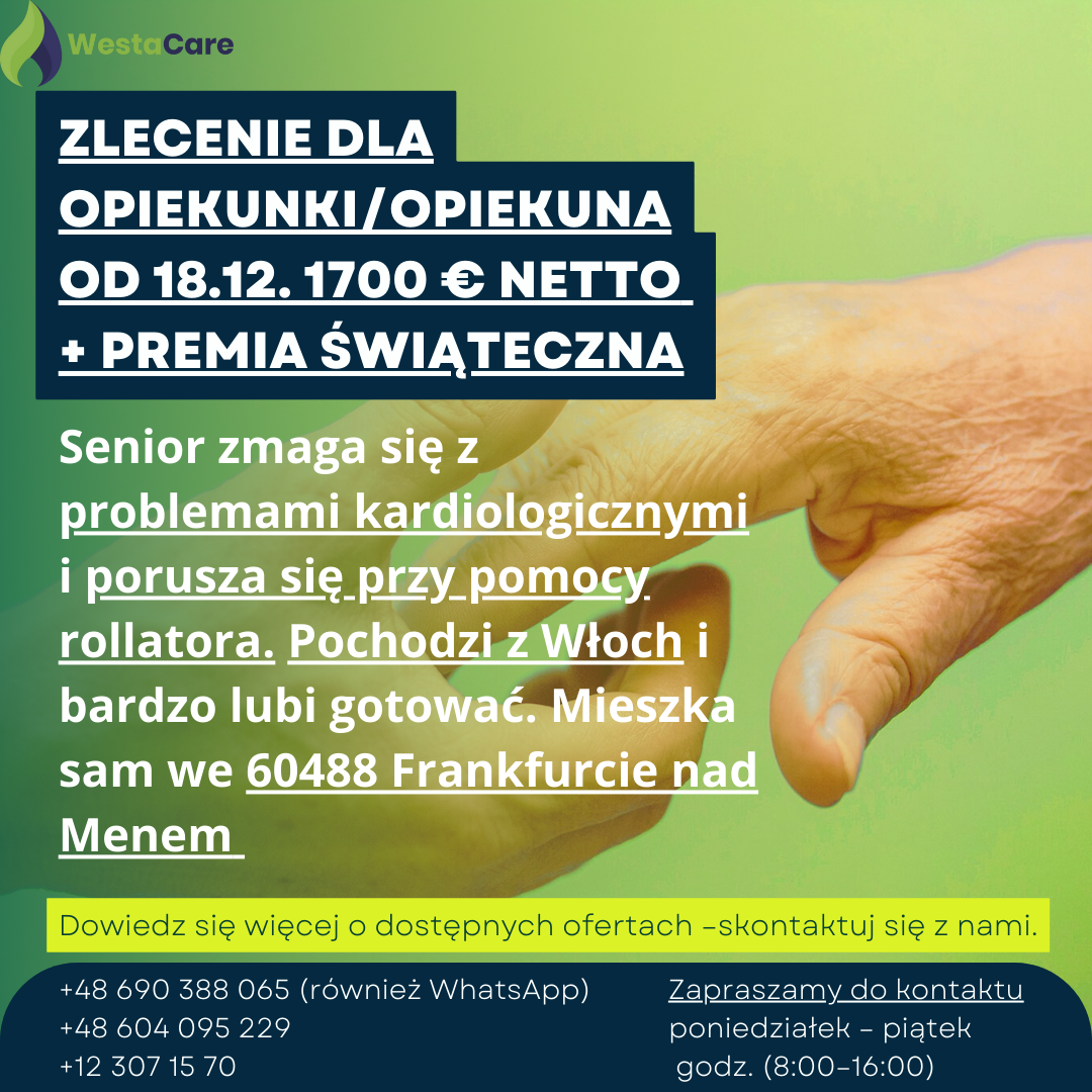 Zlecenie dla Opiekunki/Opiekuna od 18.12. 1700 € netto + Premia Świąteczna