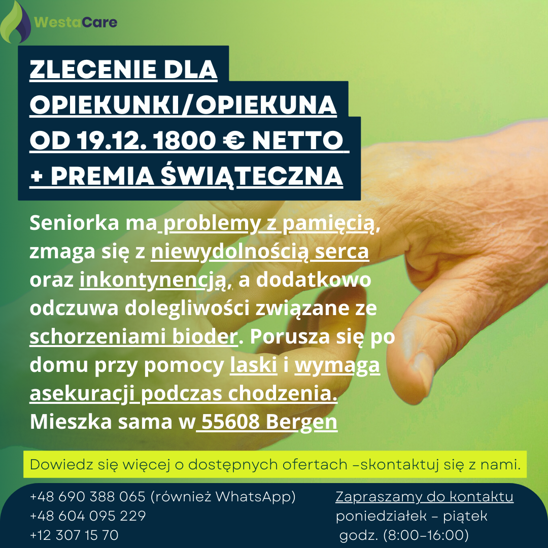 Zlecenie dla Opiekunki/Opiekuna od 19.12. 1800 € netto + Premia Świąteczna