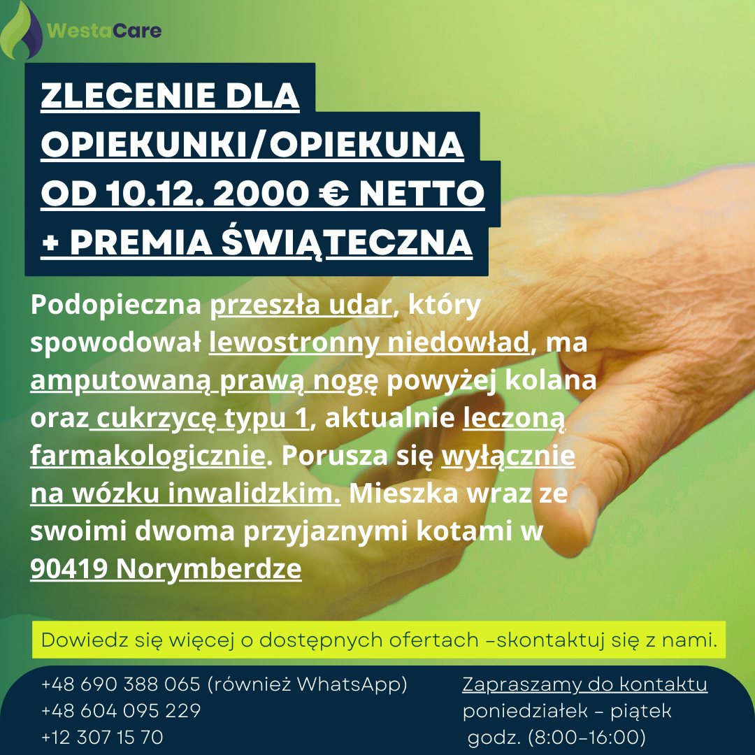 Zlecenie dla Opiekunki/Opiekuna od 10.12. 2000 € netto + Premia Świąteczna