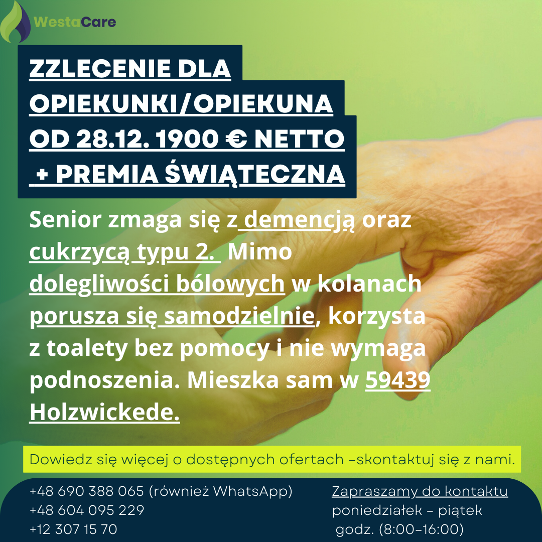 Zlecenie dla Opiekunki/Opiekuna od 28.12. 1900 € netto + Premia Świąteczna