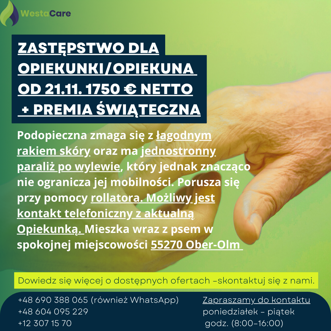 Zastępstwo dla Opiekunki/Opiekuna od 21.11. 1750 € netto + Premia Świąteczna