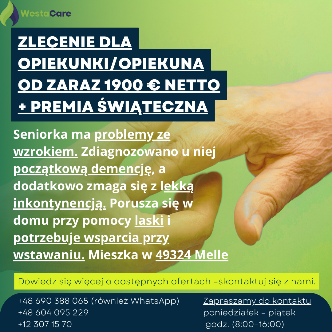 Zlecenie dla Opiekunki/Opiekuna od zaraz 1900 € netto + Premia Świąteczna