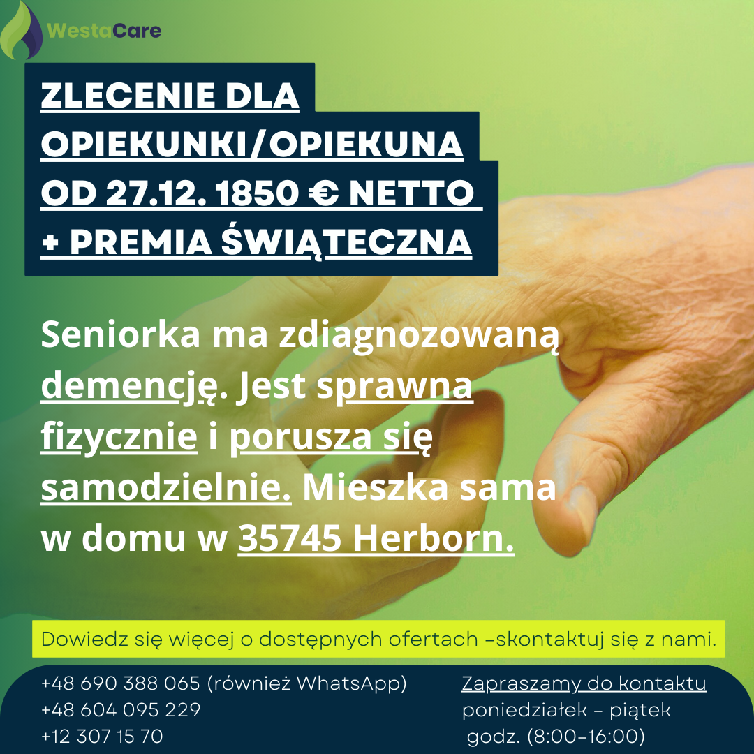 Zlecenie dla Opiekunki/Opiekuna od 27.12. 1850 € netto + Premia Świąteczna