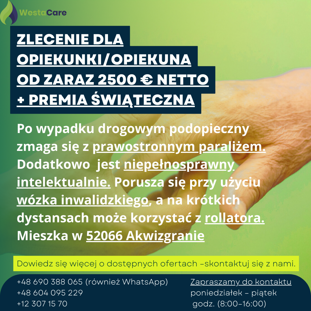 Zlecenie dla Opiekunki/Opiekuna od zaraz 2500 € netto + Premia Świąteczna